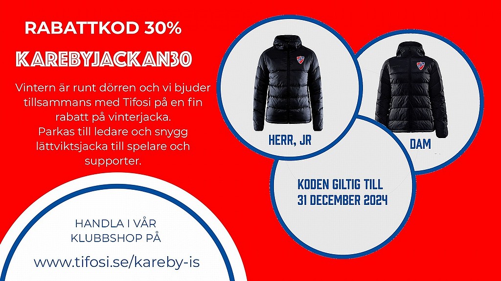Nu kommer snart kylan så passa på att köpa vår alldeles egna Kareby IS jacka till 30% rabatt. Ange bara rabattkod KAREBYJACKAN30 vid beställning hos vår leverantör Tifosi.